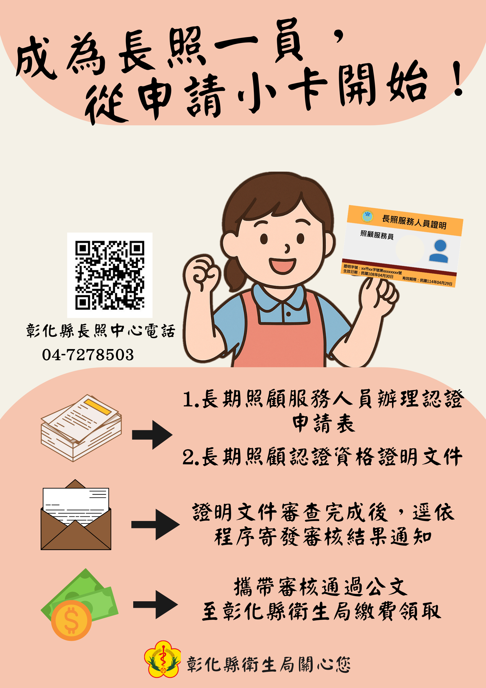 想成為長照一員,需完成相關訓練,即可申請長照小卡,成為長照專業照顧服務人員,讓自己提升技能、拓展職涯機會,用行動守護本縣長照個案。彰化縣衛生局關心您。連絡電話:04-7278503 。