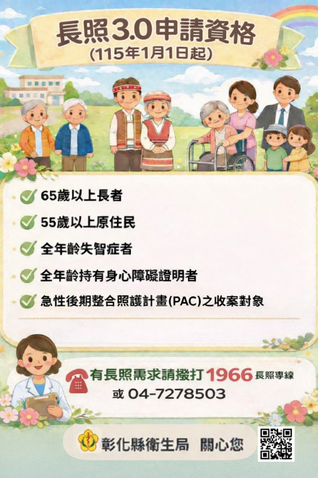 【長照3.0申請資格 (115年1月1日起)】 65歲以上長者 55歲以上原住民 全年齡失智症者 全年齡持有身心障礙證明者 急性後期整合照護計畫(PAC)之收案對象有長照需求請撥打1966長照專線或04-7278503