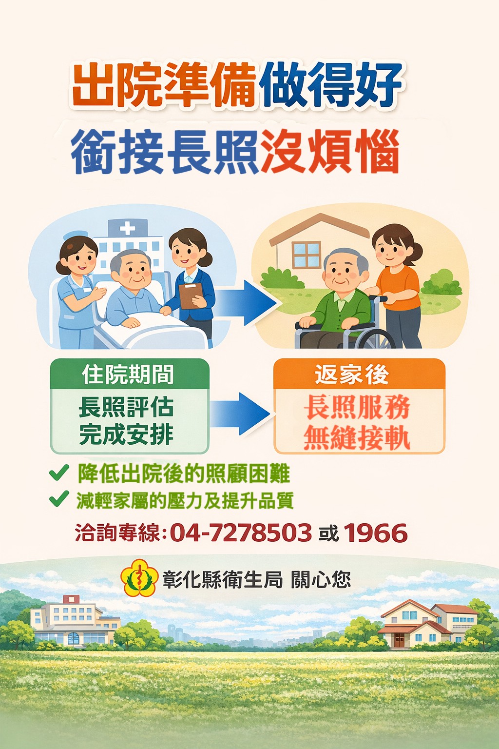 住院期間透過長照評估完成照顧安排,返家後不必奔波申請長照評估及照顧計畫。對於行動不便及需要定期回診者,能有效降低出院後的照顧困難並減輕家屬的壓力及提升整體照顧品質,歡迎洽詢04-7278503或1966。